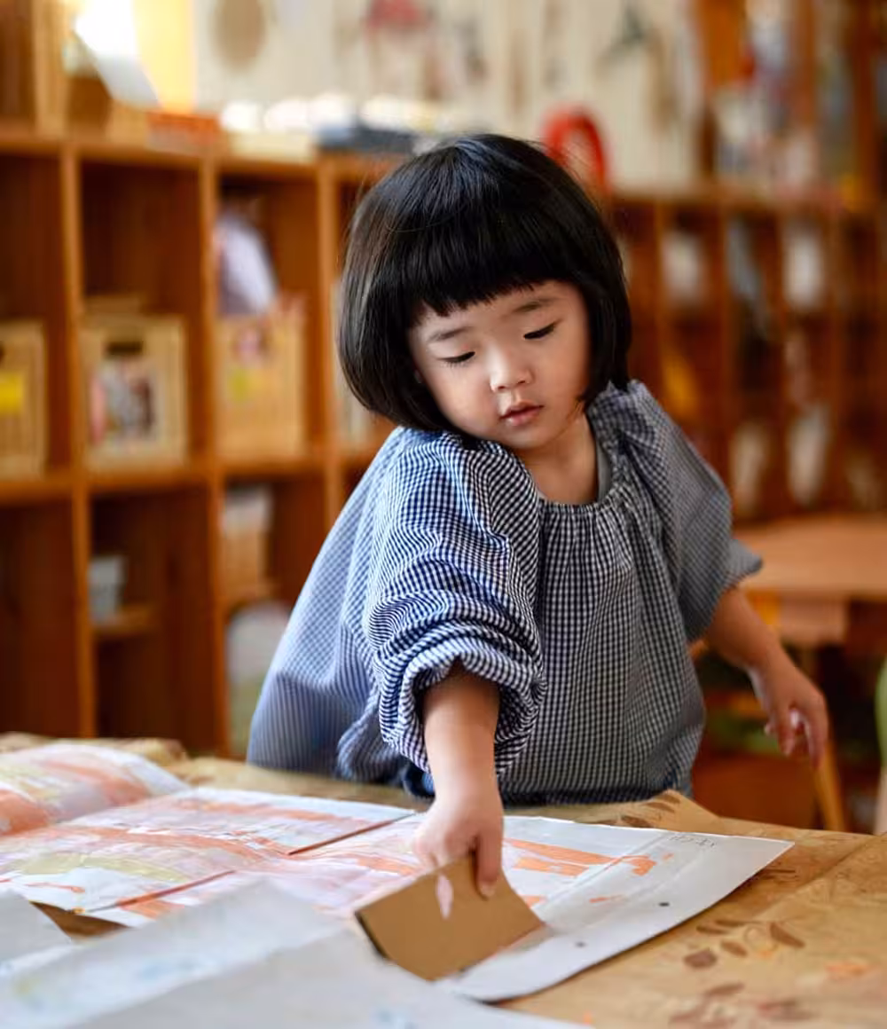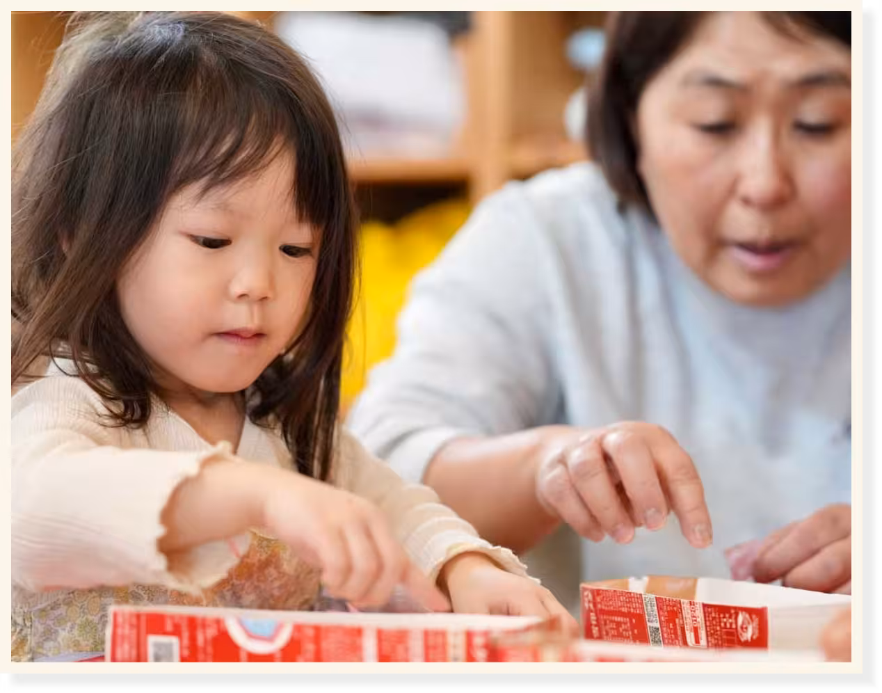 自然あそびや造形あそび、食育クッキングや異年齢交流を通して、興味や関心を広げ、考える力や表現力、社会性を育みます。