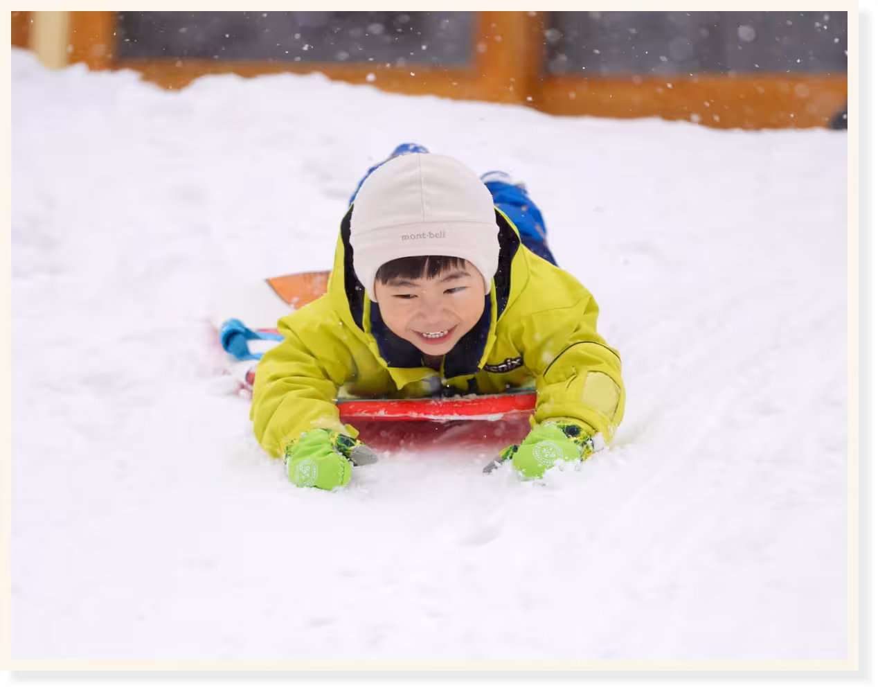 夏のキャンプや冬のソリすべりなど、豊かな自然の中であそびながら体力と創造力を育みます。室内では拾った枝や葉っぱでオブジェ作りをしたり、白い画用紙に絵の具を広げて、自然の中で体験したことをアートで表現。