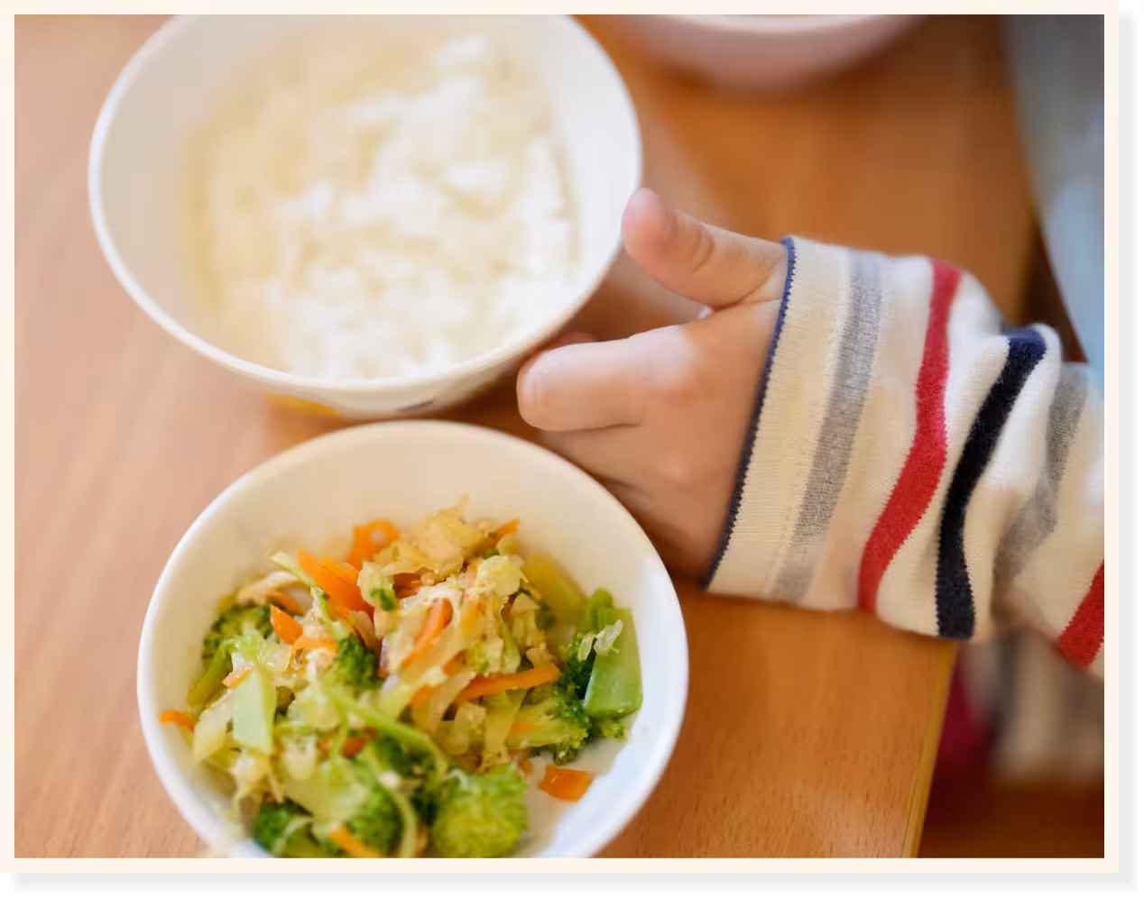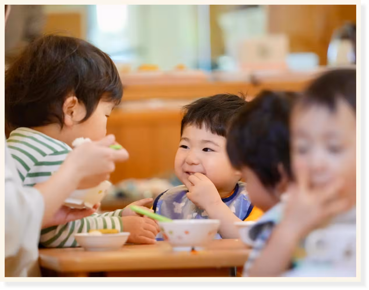 食べ渋りがある時には、一人ひとりの気持や感覚に寄り添いながら保育者がサポートし、無理なく挑戦できる環境を整えます。毎日の食事で食材への興味と豊かな味覚を育てます。