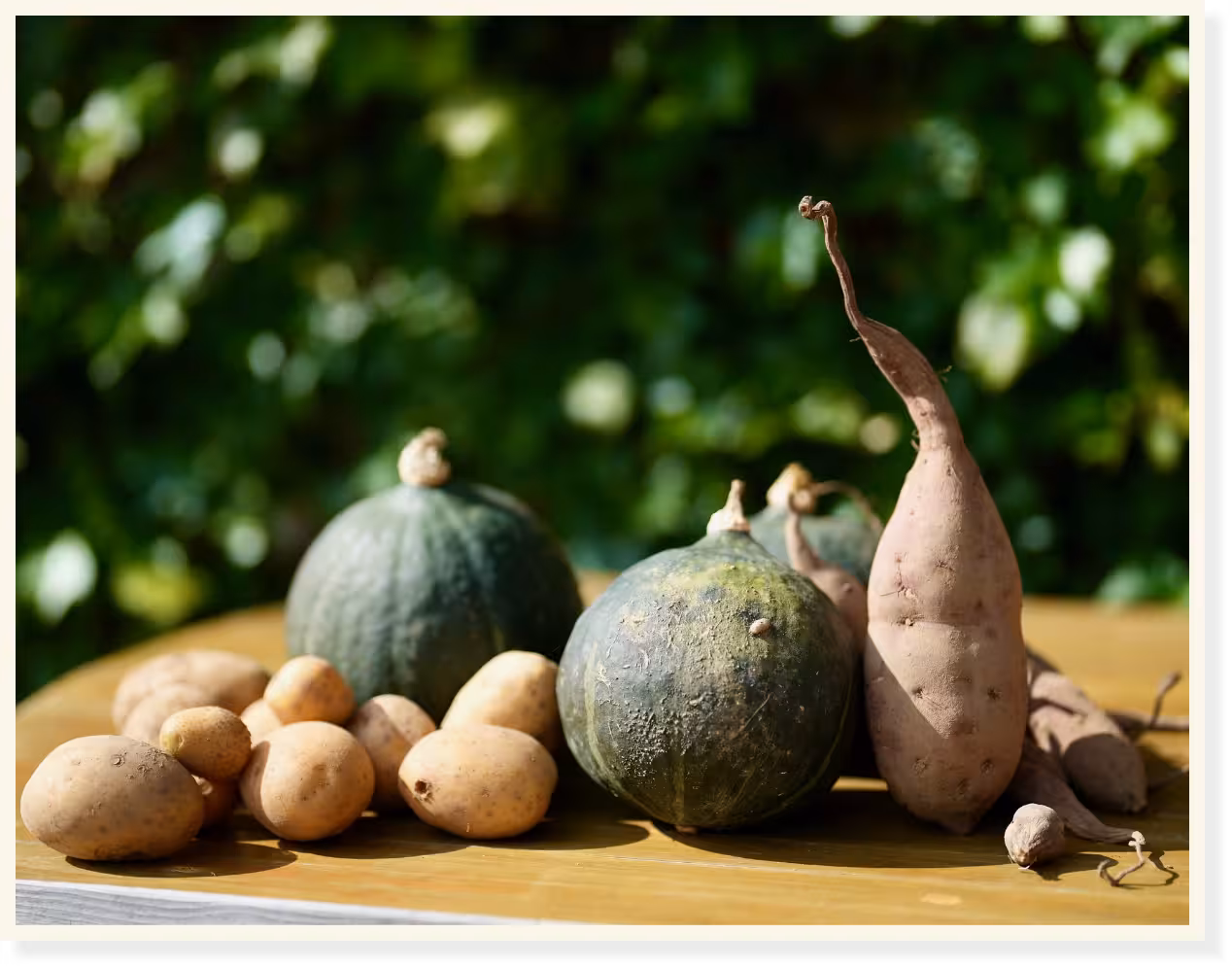 畑の野菜や庭に生えた山菜を自分たちで採ることも。年齢に合わせた体験を通して、食への興味と楽しさを育みます。